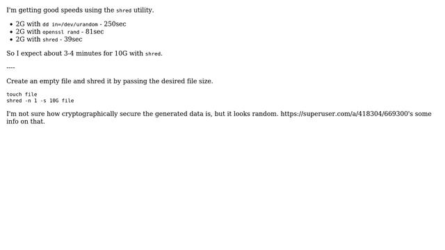 Creating a large file of random bytes quickly Helpful? Please support me on Patreon: https://www.patreon.com/roelvandepaar With thanks & praise to God, and with thanks to the many people who have made this project possible! | Content (except music & images) licensed under CC BY-SA https://meta.stackexchange.com/help/licensing | Music: https://www.bensound.com/licensing | Images: https://stocksnap.io/license & others | With thanks to user xxbinxx (superuser.com/users/353356), user Volker Siegel (superuser.com/users/309794), user Valmiky Arquissandas (superuser.com/users/345828), user skane (superuser.com/users/353270), user lyuboslav kanev (superuser.com/users/669300), user Der Hochstapler (superuser.com/users/36744), and the Stack Exchange Network (superuser.com/questions/792427). Trademarks are property of their respective owners. Disclaimer: All information is provided "AS IS" without warranty of any kind. You are responsible for your own actions. Please contact me if anything is amiss at Roel D.OT VandePaar A.T gmail.com