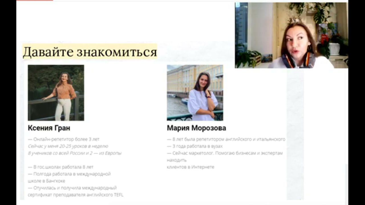 Прямой эфир состоялся 17 марта 2021 План работы: 1. Тренды в методи ке преподавания английского в 2021 Что нужно знать, чтобы идти в ногу с прогрессивными педагогами. 2. Цена и ценность урока Как планировать уроки, в которых ценность превышает цену. 3. Отношения с работодателем, учеником и родителем Как заставить их уважать себя. Как корректно говорить о неудобном, например, просить о повышении зарплаты. 4. Педагог и социальные сети Как на странице Вконтакте или Инстаграме рассказывать о своих уроках, чтобы каждый захотел у вас учиться. Наша группа ВК https://vk.com/repetitor_idet_online Следите за предстоящими событиями!