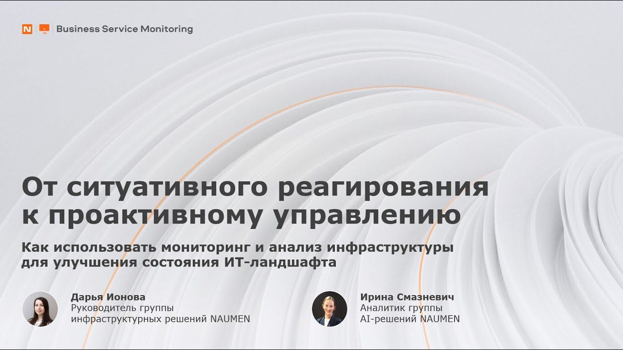 Как использовать мониторинг и анализ инфраструктуры для улучшения состояния ИТ-ландшафта. Naumen BSM: https://vk.cc/cocvcQ 0:00:49 – формат вебинара 0:01:34 – зачем нужен мониторинг 0:06:23 – возможности Naumen Business Service Monitoring 0:24:06 – предиктивный анализ в мониторинге 0:32:00 – подведение итогов