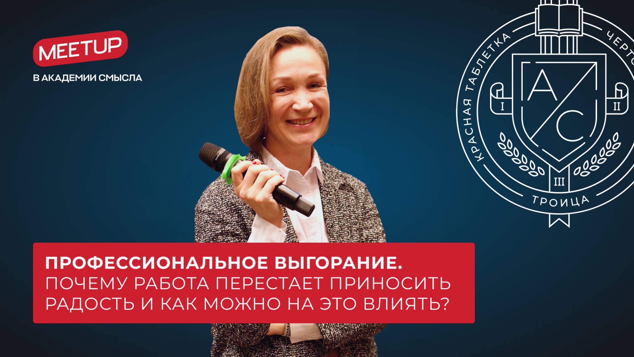 Meetup в Академии смысла — это неформальная встреча, на которой участники сообщества встречаются для обсуждения интересной темы и обмена опытом. На встрече с докладом выступает выпускник трёх ступеней Академии смысла. Сегодня мы публикуем лекцию Елены Петровой, выпускницы, ментора, инструктора 3-х ступеней Академии смысла, куратора 2 и 3 ступени “Чертоги разума” и “Троица”, консультанта проекта “Интеллектуальный помощник”, сертифицированного коуча и психолога-консультанта. Тема доклада: Профессиональное выгорание. Почему работа перестает приносить радость и как можно на это влиять? Вы узнаете почему выгорание — это защита, научитесь распознавать симптомы и узнаете способы его профилактики. Приятного просмотра! _____________________ Подать заявку на мероприятие — https://lk.intellect.academy/meetup Заходите в наши социальные сети, чтобы узнать больше о мозге, мышлении: Youtube — https://www.youtube.com/channel/UClZBC4-YXjZMSHZcMnECDsQ ВКонтакте — https://vk.com/sense.academy Telegram — https://t.me/senseacademy