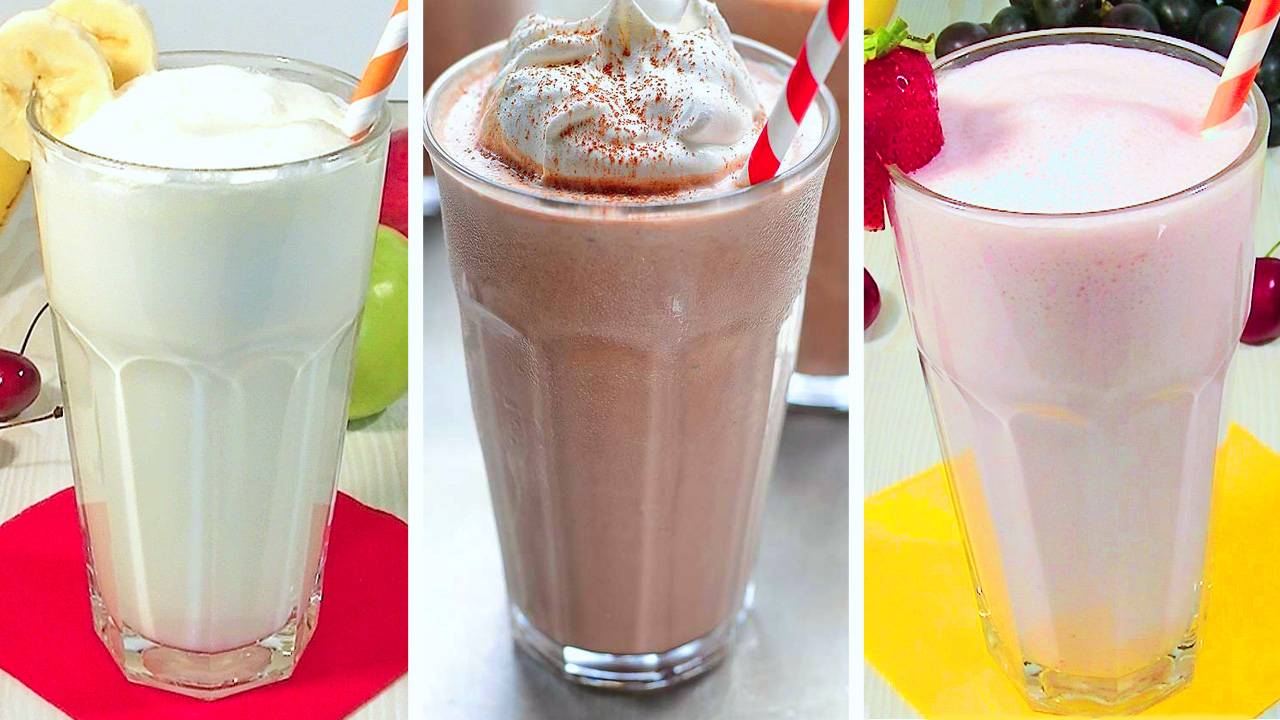 Самые простые и вкусные рецепты молочных коктейлей из мороженого. Такие коктейли можно приготовить детям, которые отказываются пить обычное молоко. Ванильный коктейль: 300 гр. натурального пломбира 500 мл. молока 1 ч. л. ванильного сахара (можно не добавлять) Клубничный коктейль: 300 гр. натурального пломбира 500 мл. молока Клубника свежая или замороженная – 200 гр. Шоколадный коктейль: 300 гр. натурального пломбира 500 мл. молока 3 ст. л. какао