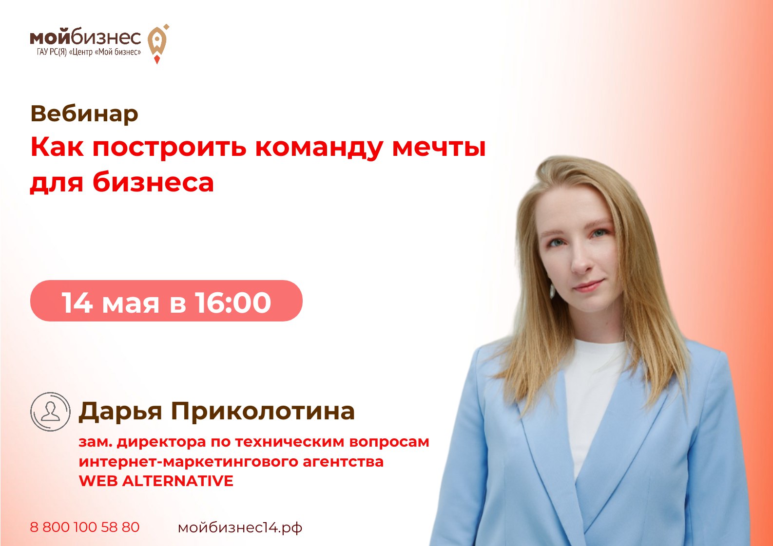 Успех в бизнесе зависит не только от производственного процесса, но и корпоративной культуры. Вы узнаете, как управлять отношениями в команде, чтобы достичь результатов на примере опыта WEB ALTERNATIVE. ✍️В программе: ✔️что такое управление, из чего оно складывается? ✔️орг.схема как фундамент для масштабирования ✔️как разглядеть настоящего руководителя? ✔️где взять тех самых, что станут командой мечты 🎙️Спикер: Дарья Приколотина, зам. директора по техн. вопросам интернет-маркетингового агентства WEB ALTERNATIVE (Хабаровск) Агентство WEB ALTERNATIVE на рынке 16 лет. За это время штат компании вырос до 30 человек, открыто 3 юр. лица в разных странах, вышли на рынок СНГ, Азии и Америки, пережито 4 кризиса — все это благодаря правильному управлению и сильной команде.