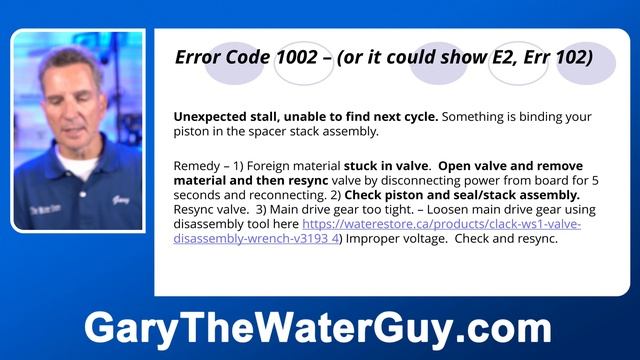 Is your Clack valved water softener showing an error code? What does it mean? Is it something you can fix yourself or do you need to call a service technician? What do the error codes mean? Do the same error codes apply to tannin and iron filters too? How do you reset the valve to clear the error code? It would be easier for you to understand water softener diagnosis and repair if you know how a water softener works, in case you don’t, check out my YouTube video here https://youtu.be/udmE-hhh084 I am going to be demonstrating these diagnostics on this Clack WS1 CC or CI valve. If you would like to check the diagnostics section of the Clack Manual, you can see it here http://clackvalves.net/pdf/documents/CI%20programming%20manual.pdf Error Code 1001 – (or it could show E1, Err 101) Unable to recognize start of regeneration. The optical eye in the valve is not able to determine if the parts of the valve are in the correct location. It will try for a short time and then give you the error. Error Code 1002 – (or it could show E2, Err 102) Unexpected stall, unable to find next cycle. Something is binding your piston in the spacer stack assembly. Error Code 1003 – (or it could show E3, Err 103) – Motor ran to long, timed out trying to reach next cycle position. Error Code E4 – Control valve motor ran too long. Drive bracket not snapped in properly. Snap it in and resync. Error Code 1004 – (or it could show Err-104) - Motor ran to long, timed out trying to reach home position. Drive bracket not snapped in properly. Error Code 1006 – (or it could show Err-116, Err 106) – Valve not recognizing MAV. Control valves programmed incorrectly. Error Code 1007 – (or it could show Err-117, Err 107) Foreign matter is lodged in MAV causing mechanical binding. Looking for Clack Water Softener Replacement Parts? Check this out https://waterestore.ca/search?type=product&q=Clack* Clack WS1 Valve Disassembly and Rebuild Video https://youtu.be/rWh1r3idZm0 Clack Water Softener Programming Video https://youtu.be/c6r7qUK8to4 Clack Water Softener Running to Drain https://youtu.be/RhvspR3PAw8 Click here for your next video on water softeners and I’ll see you there! https://www.youtube.com/playlist?list=PLmnBltD77jBXSLyXWZw3cSXj2VyAY9PMu Any questions or comments about this video or water softeners in general? Please enter them below, I read them all and would love to answer yours. LOVE GARY THE WATER GUY AND WANT TO LEARN MORE ABOUT WATER FILTRATION FOR YOUR FAMILY? HERE ARE SOME NEXT STEPS! Sign up to keep in touch with Gary! https://mailchi.mp/waterestore.com/subscription 2) LET’S CONNECT! https://www.facebook.com/WaterEstore/ https://twitter.com/WaterEstore https://www.linkedin.com/company/the-water-filter-estore/ https://www.instagram.com/Water_Estore/ https://www.instagram.com/WaterStoreMidland/ 3) CONTACT! info@WaterEstore.com or info@WaterStoreMidland.com 4) SHOP! Midland https://www.WaterStoreMidland.com Canada https://www.WaterEstore.ca USA https://www.WaterEstore.com Please share this video https://youtu.be/v_oF5w5dB1U Please comment or ask questions below. #watersoftener#garythewaterguy#clackws1