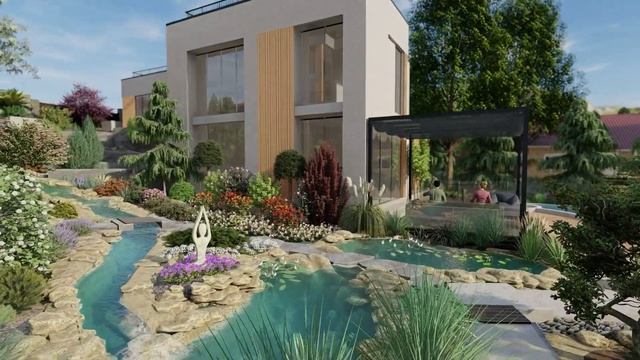 Закажите ландшафтный проект, озеленение и благоустройство: https://clck.ru/32TTh3 Ландшафтный дизайн частного дома в Сочи Площадь участка 5 соток Проектирование 2022 г. Проектируемая территория граничит с национальным парком. Задача: озеленить территорию таким образом, чтобы создавалось впечатление продолжения парка на участке. Решение: сама территория - террасированный склон, который необходимо было облагородить. За участком находится горный ручей, заказчик хотел повторить его форму и вид, что мы и сделали. Подбор растений осуществлялся нашими дендрологами, задача была объединить тропические растения с хвойными и декоративными на 5 сотках. При этом учитывалось соседство, роза ветров, освещённость и т.д. Проектирование продумывалось отталкиваясь от существующих дорожек. На проекте оформили три пруда, плавно перетекающих друг в другая. Около гостевого дома, вдоль забора из арт бетона оформили водопад, который плавно переходит в основной ручей под мостиком. Были варианты различных скульптур, но выбор пал именно на эти, т.к. заказчик увлекается йогой.