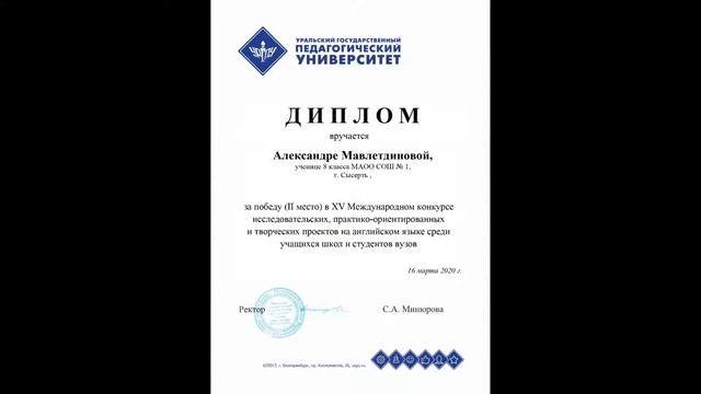 Ученица 8 класса СОШ № 1 г. Сысерти Александра Мавлетдинова стала призером XV Международного конкурса исследовательских, практико-ориентированных и творческих проектов на английском языке среди учащихся школ и студентов вузов. Конкурс проводится ежегодно на площадке Института иностранных языков УрГПУ. Среди его участников в этом году - авторы проектов из гимназий и вузов Екатеринбурга и Свердловской области, Франции, Северной Македонии и др. Поздравляем Александру и желаем новых успехов и достижений!!!