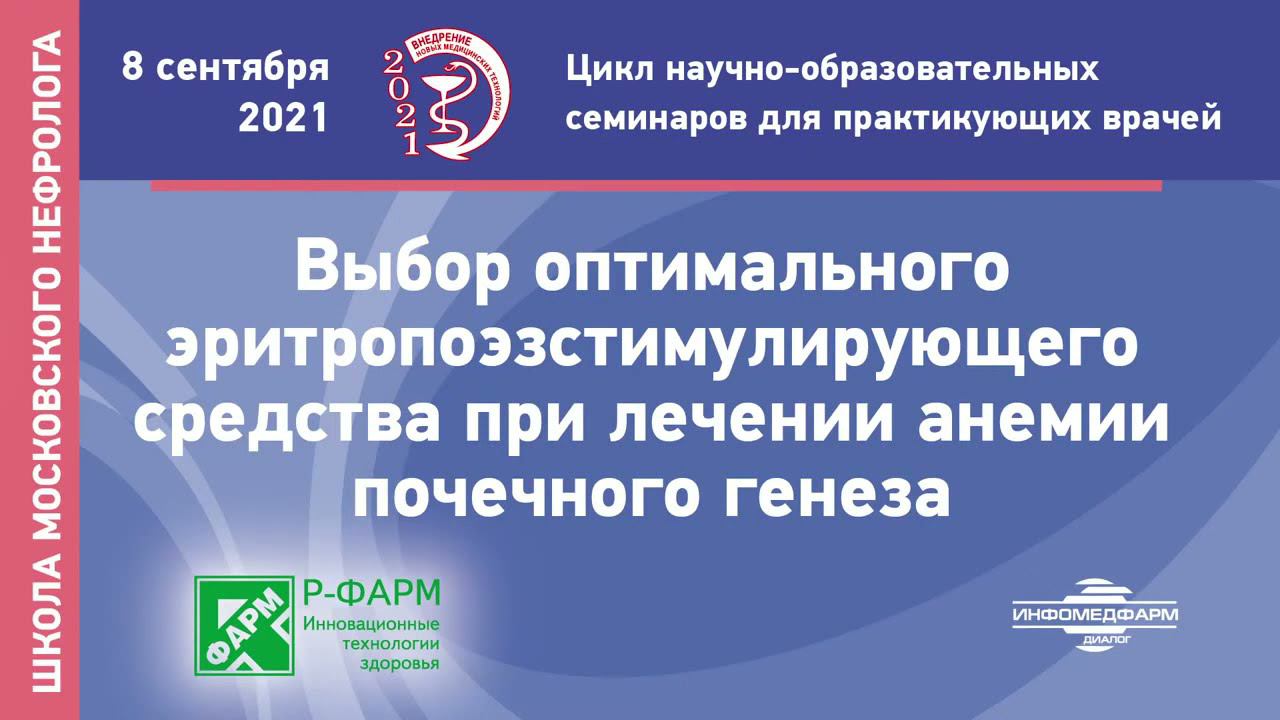 Научно-образовательный семинар «Выбор оптимального эритропоэзстимулирующего средства при лечении анемии почечного генеза» Проект «Школа московского нефролога» Руководитель проекта Котенко Олег Николаевич Докладчики: Шутов Е.В., заведующий кафедрой нефрологии и гемодиализа ФГБОУ ДПО РМАНПО Минздрава России, руководитель Межокружного нефрологического центра ГБУЗ «ГКБ им. С.П. Боткина» ДЗМ, врач-нефролог высшей квалификационной категории, профессор, д.м.н. Михайлова Наталья Алексеевна, доцент кафедры нефрологии и гемодиализа ФГБОУ ДПО РМАНПО Минздрава России, врач-нефролог, к.м.н. Нас можно найти: Сайт ‒ https://nephroliga.ru/ ------------------------------------------------------------------------------------------------- Facebook ‒ https://www.facebook.com/nephroliga.ru/ ------------------------------------------------------------------------------------------------- Instagram ‒ https://www.instagram.com/nephroliga/ ------------------------------------------------------------------------------------------------- Трансплантация? Я – за! ‒ https://donor4life.ru/ ------------------------------------------------------------------------------------------------- TransplantNet ‒ https://xn--80aa6ahcjekfi.net/info ------------------------------------------------------------------------------------------------- VK ‒ https://vk.com/nefropravo