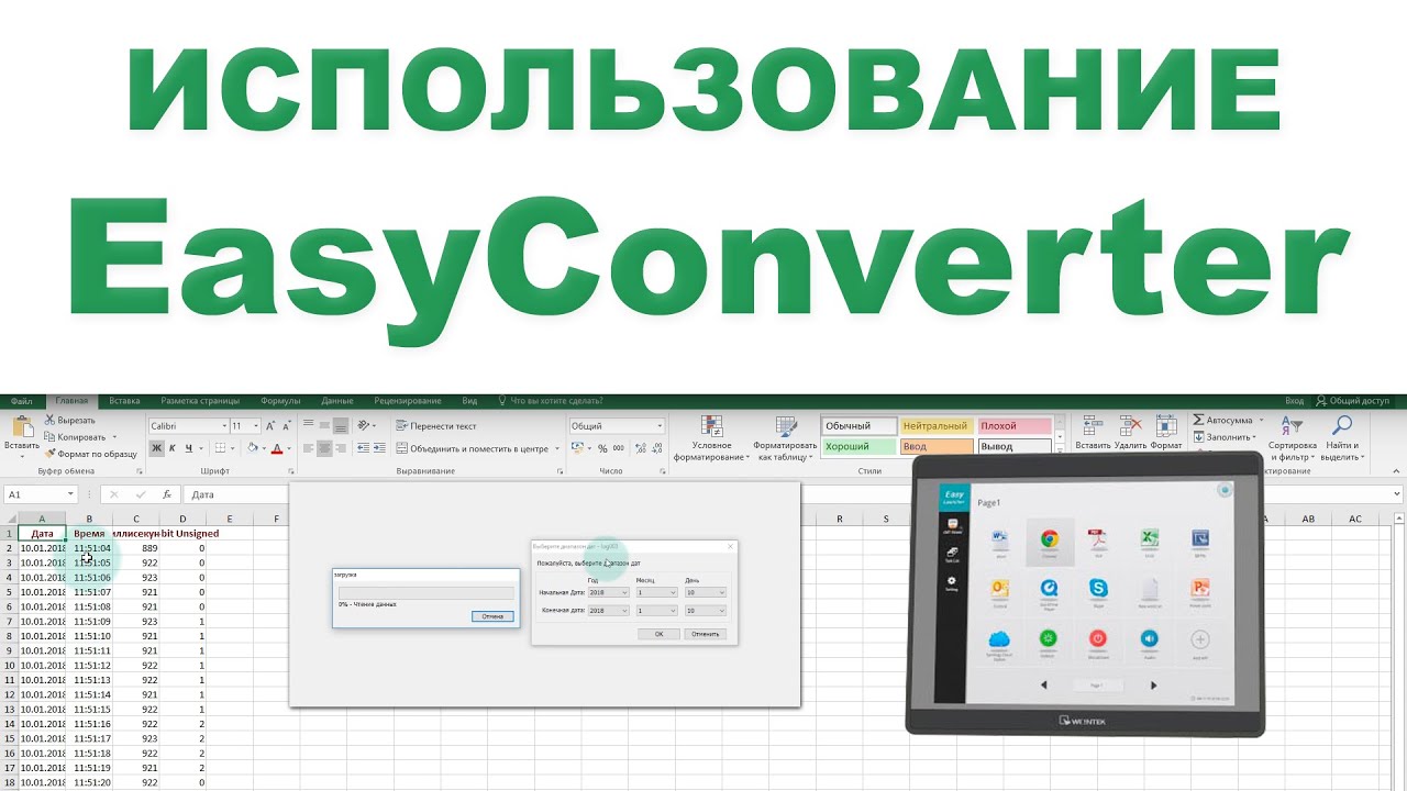 Официальный сайт http://www.rusavtomatika.com и http://www.weintek.net/ В этом видео вы узнаете: 1) Что такое EasyConverter; 2) Что такое cMT и не cMT лог-файлы ; 3) Как использовать пакетную обработку; В этом видео вы узнаете: 1) Что такое EasyConverter; 2) Что такое cMT и не cMT лог-файлы ; 3) Как использовать пакетную обработку; Запустить EasyConverter можно двумя способами. 1) Из Utility Manager: [Конвертирование данных]-[EasyConverter] 2) Из EasyBuilderPro: [Инструменты]-[Конвертация журнала событий] Давайте откроем файл журнала выборки данных для модели cMT серии. Можно выбрать диапазон дат. Можно настроить количество цифр в дробной части и масштабирование. Для экспорта данных в формат Excel нажмите соответствующую иконку. Теперь давайте откроем файл журнала событий для модели не cMT серии. Кликните иконку экспорта в Excel. В поле "Событие" вы можете видеть его код, который может принимать такие значения: 0 - Event triggered – Событие произошло; 1 - Event acknowledged – Событие подтверждено; 2 - Event returns to normal – Событие вошло в норму Пакетная обработка файлов С помощью пакетной обработки файлов можно открыть несколько файлов журналов и сгенерировать объединенный Excel файл. Нажмите иконку "Пакетная обработка" и выберите несколько файлов журнала. Отметьте галочку "Объединить с файлом" и "Слияние данных в одиночную страницу". Введите имя Excel-файла, в который будет производиться экспорт данных. Как видите, данные каждого файла попали на отдельный лист.