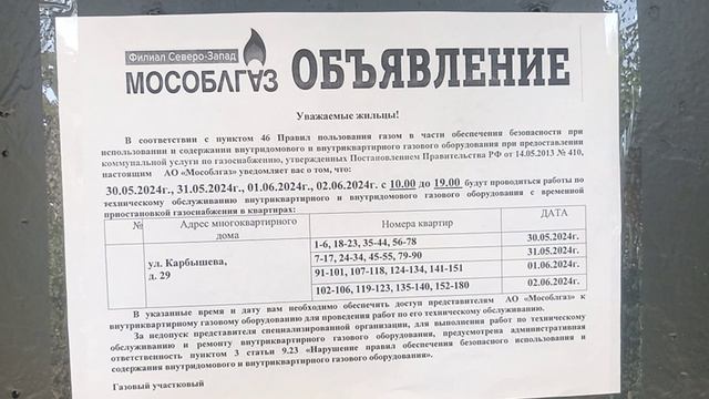 Всем добрый вечер. Сегодня увидели данное объявление на двери подъезда. В нем отсутствует печать и телефон, если например вам не удобны даты. Напоминаю, что мы ежемесячно оплачиваем данный выезд специалиста, только в квитанции мособлерц за обслуживание газа графа ТО ВКГО 114,33 руб каждый месяц. По этой причине к вам должны приходить тогда, когда и вам аналогично удобно. При этом обратите внимание, что до 2023 года включительно нас обслуживало АВГ Сервис, с этого года только сотрудники Мособлгаз. По этой причине смотрите внимательно документы и помните, что ничего вы оплачивать на месте не должны!!! Скажите это вашим близким, родителям и родственникам. Телефона горячей линии нет , есть только городской, при этом мне уже который раз говорят, что я 10 в очереди...это не обслуживание за наши денежные средства, а просто издевательство над людьми. Необходимо провести проверку этой компании, так как это не сервис... напоминаю, что мы все это оплачиваем!!! Всем безопасного города и жилища! #2024 #россия #красногорск #город #дом #газ #мособлгаз