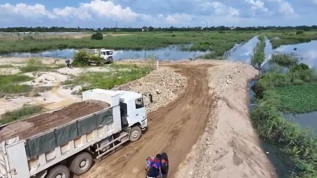 Отсыпка участка. Бульдозер Shantui толкает грунт. Авария грузовика на 2:44:44.