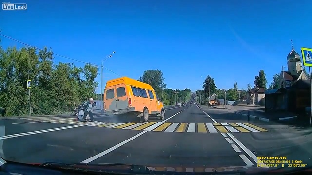 Смоленская Область. Маршрутное такси после столкновения с легковых автомобилем, едва не сбило женщину на пешеходном переходе.