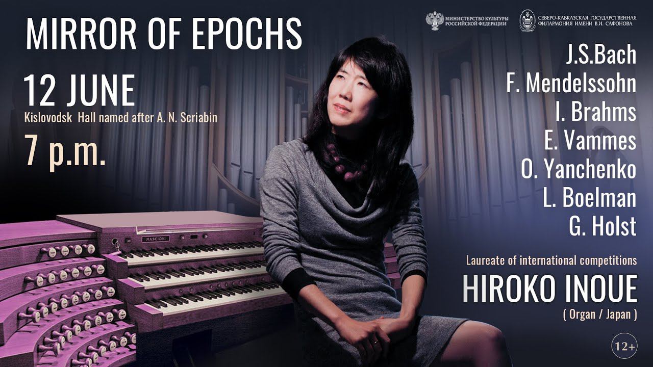 И.С Бах: Хоральная обработка «Господь Христос, Единственный сын Бога» из кантаты BWV 22 И.С Бах: Фантазия и фуга соль минор BWV 542 Ф .Мендельсон: Прелюдия и фуга до минор Й. Брамс: Хоральные прелюдии «Всем сердцем радуюсь», «Роза расцвела», «Всем сердцем стремлюсь я к блаженной кончине» Л .Боэльман: «Готическая сюита» Э. Ваммес: Зеркало О. Янченко: Медитация Г. Холст: : «Юпитер, приносящий радость» из цикла «Планеты» Лауреат международных конкурсов Хироко Иноуэ (Орган/Япония) Hall named after A. N. Scriabin "Mirror of eras" I.S. Bach, F. Mendelssohn, I. Brahms, E. Wammes, O. Yanchenko, L. Boelmann, G. Holst Laureate of international competitions Hiroko Inoue (Organ/Japan) Sala que lleva el nombre de A. N. Scriabin "Espejo de eras" ES. Bach, F. Mendelssohn, I. Brahms, E. Wammes, O. Yanchenko, L. Boelmann, G. Holst Laureado de concursos internacionales Hiroko Inoue (Órgano/Japón)