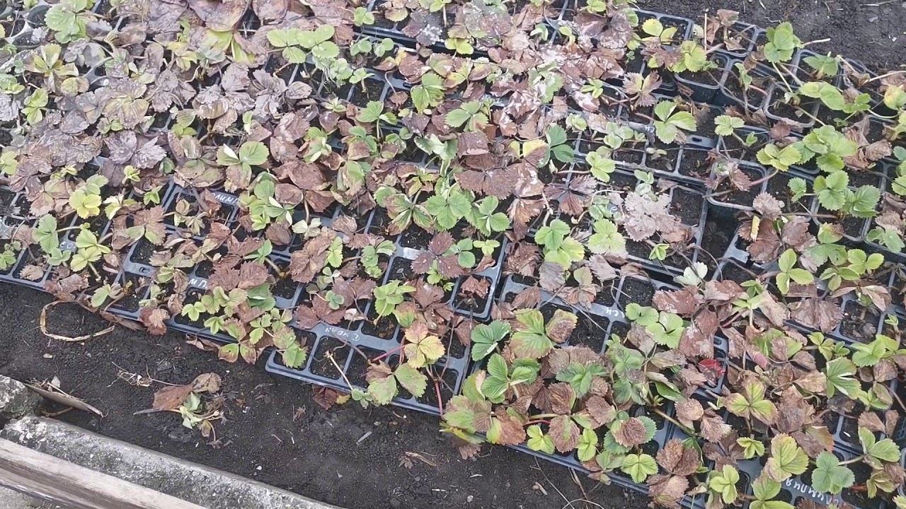 Рассада земляники (клубники) в стаканчиках после зимовки в укрытии.
