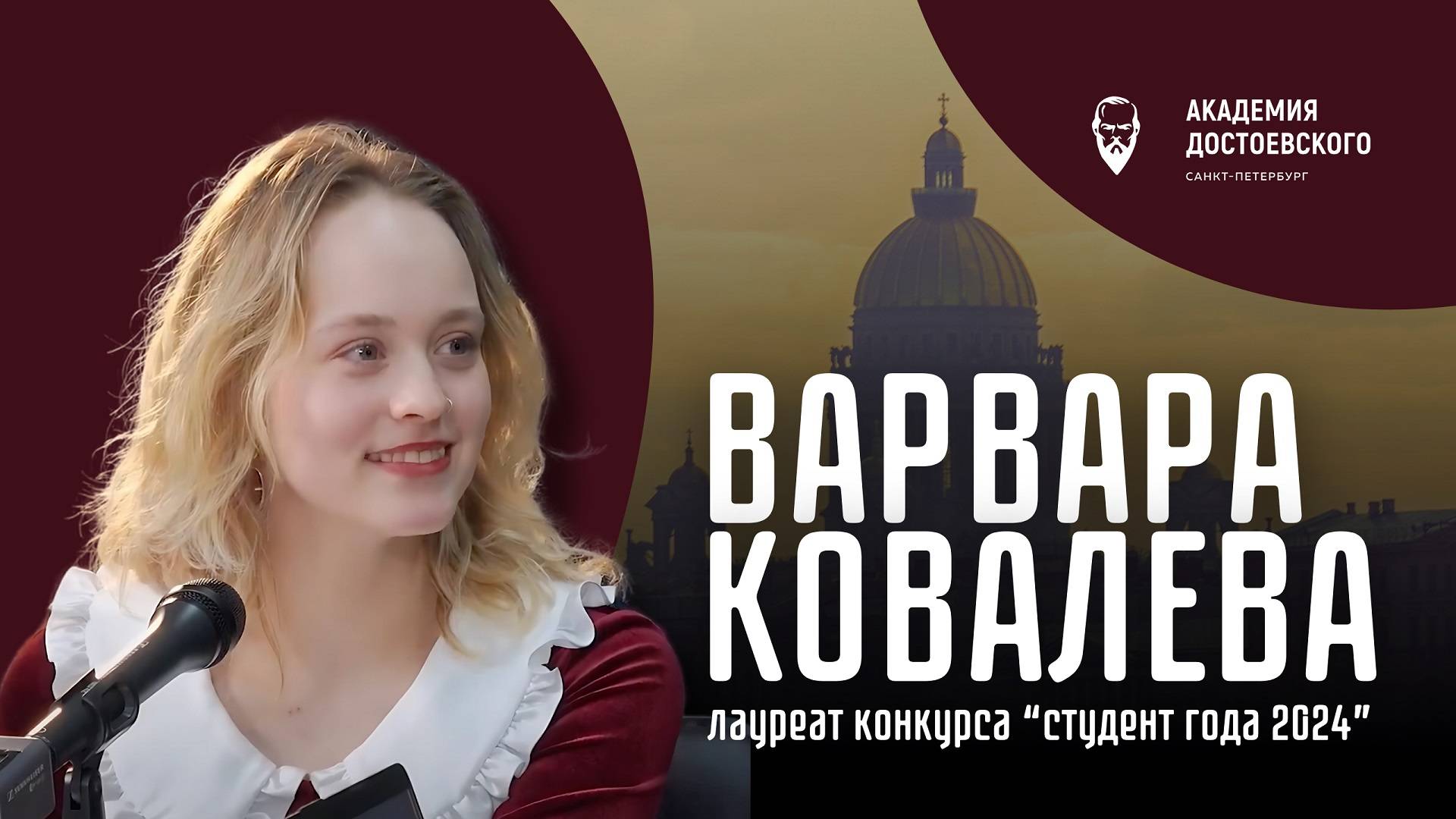 Варвара Ковалева – студентка 4 курса образовательной программы «Колледж иностранный языков» Колледжа РХГА, лауреат конкурса «Студент года 2024». Ведущий – Игорь Олегович Загашев, проректор по среднему профессиональному образованию Академии Достоевского, директор Колледжа РХГА.
