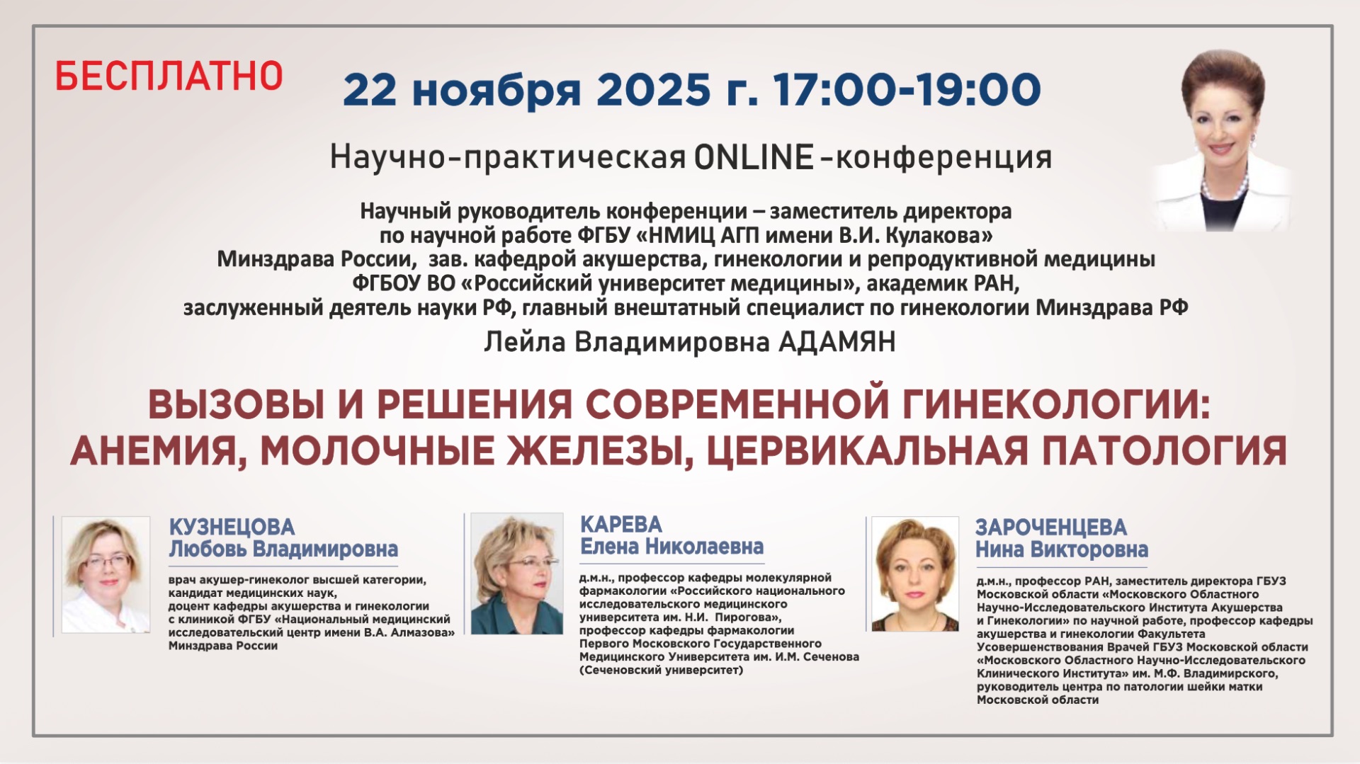 Научно-практическая онлайн конференция: ВЫЗОВЫ И РЕШЕНИЯ СОВРЕМЕННОЙ ГИНЕКОЛОГИИ: АНЕМИЯ, МОЛОЧНЫЕ ЖЕЛЕЗЫ, ЦЕРВИКАЛЬНАЯ ПАТОЛОГИЯ Приглашаем вас на симпозиум, где ведущие эксперты обсудят ключевые вопросы женского здоровья. Вас ждет разбор практических аспектов диагностики и ведения железодефицитной анемии у акушеров-гинекологов, современные подходы к негормональной терапии доброкачественных заболеваний молочных желез, а также пути внедрения клинических рекомендаций при ЦИН в реальную медицинскую практику. Мероприятие будет полезно специалистам, стремящимся к внедрению лучших стандартов и новых знаний в повседневную работу. ------------------------------------------------------------- НАУЧНЫЙ РУКОВОДИТЕЛЬ КОНФЕРЕНЦИИ: АДАМЯН Лейла Владимировна Заместитель директора ФГБУ «НМИЦ акушерства, гинекологии и перинатологии имени В.И. Кулакова» Минздрава России, зав. кафедрой репродуктивной медицины и хирургии ФГБОУ ВО «Российский университет медицины», академик РАН, заслуженный деятель науки РФ, главный внештатный специалист по гинекологии Минздрава РФ ------------------------------------------------------------- СПИКЕРЫ: КУЗНЕЦОВА Любовь Владимировна — врач акушер-гинеколог высшей категории, кандидат медицинских наук, доцент кафедры акушерства и гинекологии с клиникой ФГБУ "Национальный медицинский исследовательский центр имени В.А. Алмазова" Минздрава России КАРЕВА Елена Николаевна — д.м.н., профессор кафедры молекулярной фармакологии «Российского национального исследовательского медицинского университета им. Н.И. Пирогова», профессор кафедры фармакологии Первого Московского Государственного Медицинского Университета им. И.М. Сеченова (Сеченовский университет) ЗАРОЧЕНЦЕВА Нина Викторовна — д.м.н., профессор РАН, заместитель директора ГБУЗ Московской области «Московского Областного Научно-Исследовательского Института Акушерства и Гинекологии» по научной работе, профессор кафедры акушерства и гинекологии Факультета Усовершенствования Врачей ГБУЗ Московской области «Московского Областного Научно-Исследовательского Клинического Института» им. М.Ф. Владимирского, руководитель центра по патологии шейки матки Московской области ------------------------------------------------------------- ПРОГРАММА КОНФЕРЕНЦИИ: 1) "ЖДА: ПРАКТИКУМ МНОГОЗАДАЧНОСТИ ДЛЯ АКУШЕРА – ГИНЕКОЛОГА" ( Кузнецова Любовь Владимировна ) 2) "НЕГОРМОНАЛЬНАЯ ТЕРАПИЯ ДОБРОКАЧЕСТВЕННЫХ ЗАБОЛЕВАНИЙ МОЛОЧНЫХ ЖЕЛЕЗ: НОВЫЕ ДАННЫЕ И ПРОВЕРЕННЫЕ ВРЕМЕНЕМ РЕШЕНИЯ" ( Карева Елена Николаевна ) 3) "ЦИН. ОТ КЛИНИЧЕСКИХ РЕКОМЕНДАЦИЙ К КЛИНИЧЕСКИМ НАБЛЮДЕНИЯМ" ( Зароченцева Нина Викторовна ) «Дискуссия. Ответы на вопросы» Адамян Л.В., Кузнецова Л.В., Карева Е.Н., Зароченцева Н.В.