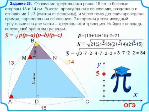Основание треугольника равно 15 см, а боковые стороны 13 и 14 см. Высота, проведённая к основанию, разделена в отношении 1 : 3 (считая от вершины), и через точку деления проведена прямая, параллельная основанию. Эта прямая делит исходный треугольник на две части – треугольник и трапецию. Найдите площадь полученной при этом трапеции.