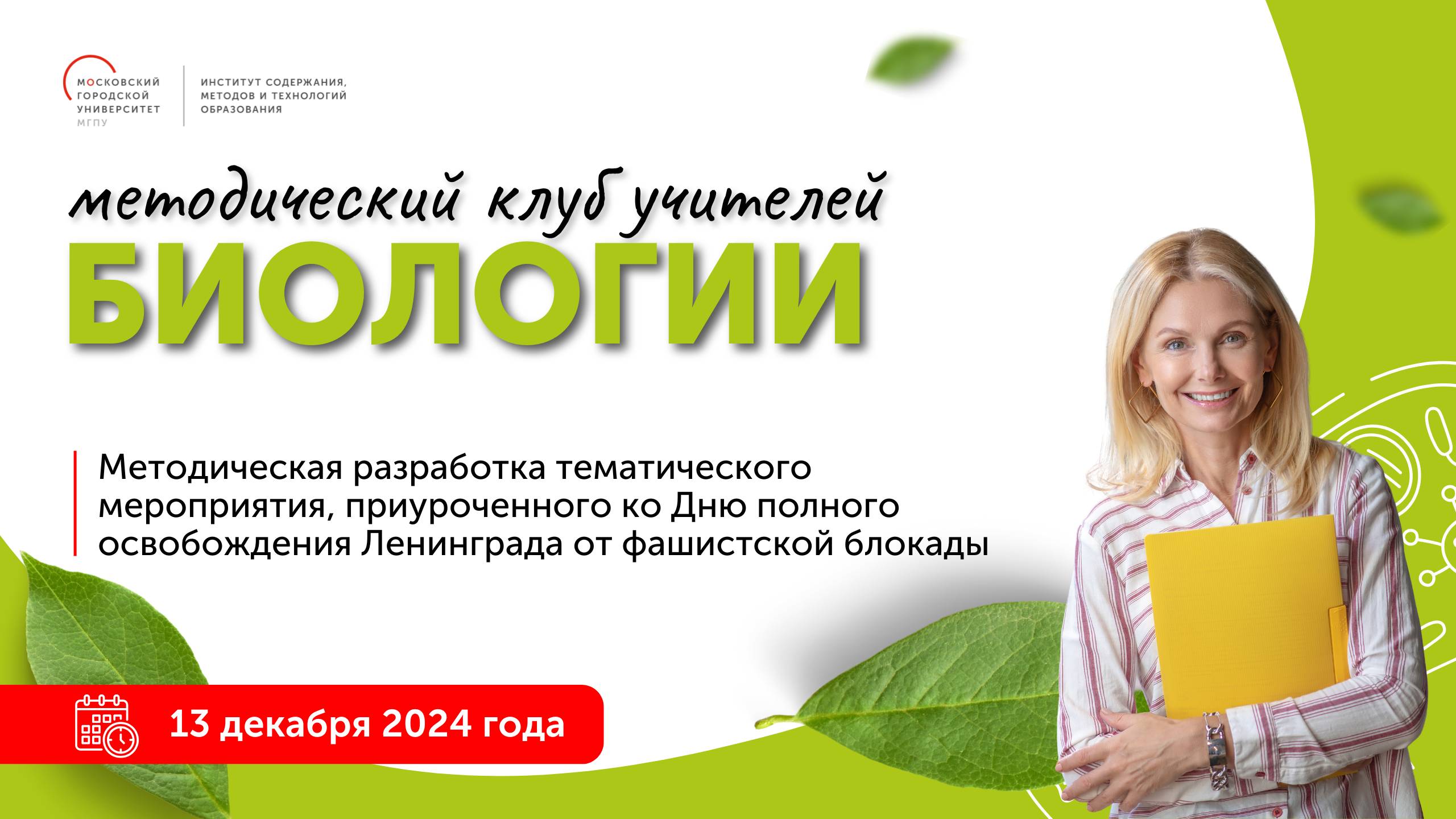Методическая разработка тематического мероприятия, приуроченного ко Дню полного освобождения Ленинграда от фашистской блокады "Интеграция в процесс обучения и воспитания тематических блоков, взаимосвязанных событийными ситуациями (мероприятиями), позволяет создать единое воспитательно-событийное пространство для всех участников образовательного процесса, ориентированное на формирование ценностных и социально-значимых качеств, обеспечивающих необходимые условия для личностного самоопределения и самореализации обучающихся. Это способствует активизации учебного процесса, развивает наблюдательность, внимание, память, мышление. Задания, предлагаемые обучающимся для выполнения во время таких мероприятий, могут применяться как для проверки и закрепления приобретенных ранее знаний, так и для их расширения и углубления. Целью подобных разработок является не только расширение кругозора, раскрытие творческих способностей обучающихся, воспитание патриотизма, но и развитие коммуникативных способностей, умения работать в команде, пользоваться ИКТ-технологиями, отбирать и анализировать информацию. На очередной встрече в рамках проекта «Методический клуб по биологии» будет представлено транслирование педагогического опыта по организации и проведению тематического мероприятия, посвящённого одному из дней воинской славы России. Вебинар состоится 13 декабря в 16:00. Ведущие — старший методист ИСМиТО МГПУ, кандидат биологических наук Евгений Александрович Блинков и учитель биологии ГБОУ г. Москвы «Школа № 1002» Елена Владимировна Белогорцева."