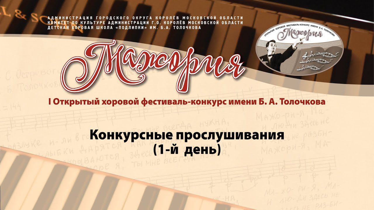 Хоровой фестиваль-конкурс им. Б.А. Толочкова "Мажория". (Конкурсные прослушивания 1 день) 12 ноября, суббота 1. Хор «Росинка» МБУ ДО «Детская хоровая школа «Подлипки», г.о. Королёв, Руководитель хора - Кошелева Александра Андреевна 2. Хор «Капелька» МБУ ДО «Детская хоровая школа «Подлипки», г.о. Королёв, Руководитель хора - Шевченко Дарья Александровна 3. Хор «Родничок» МБУ ДО «Детская хоровая школа «Подлипки», г.о. Королёв, Руководитель хора - Черкез Марина Владимировна 4. Хор «Ручеёк» МБУ ДО «Детская хоровая школа «Подлипки», г.о. Королёв, Руководитель хора - Любимова Елена Александровна 5. Образцовый хор «Поток» МБУ ДО «Детская хоровая школа «Подлипки», г.о. Королёв, Руководитель хора - Яковлева Инна Алмазовна 6. Вокальный ансамбль «Мелодия» МБУ ДО «Жуковская детская школа искусств № 1», г.о. Жуковский, Руководитель коллектива - Меденцева Елена Владимировна 7. Хор «Поющая лира» МУ ДО Фрязинская детская школа искусств, г.о. Фрязино, Руководитель хора - Диденко Елена Михайловна 8. Коллектив «Гармония» МБОУ «Гимназия № 17», г.о. Королёв, Руководитель коллектива - Оськина Светлана Валерьевна 9. Вокально-хоровой ансамбль «Сопрано» МБОУ ПСОШ № 2 им. М.Ф. Тихонова, г.о. Королёв, Руководитель коллектива - Казьмина Эльвира Иосифовна 10. Женский хор отделения хорового дирижирования МГКИ ГАПОУ МО «Московский губернский колледж искусств», г. Химки, Руководитель хора - Констанди Валентин Валентинович 11. Юношеский вокальный ансамбль отделения хорового дирижирования МГКИ ГАПОУ МО «Московский губернский колледж искусств», г. Химки, Руководитель коллектива - Никулина Анна Александровна "Мажория". (Конкурсные прослушивания 2-й день) https://youtu.be/Ly_trpEyhRg