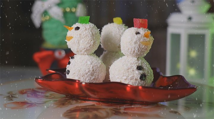Простая кухня | Десерт "Снеговики" Рецепт: Творог - 250 г Кокосовая стружка - 120 г Банан - 85 г Мёд - 40 г Орехи грецкие - 50 г Для украшения: Чернослив без косточек - 5 г Курага - 5 г Цукаты (цветные) - 5 г