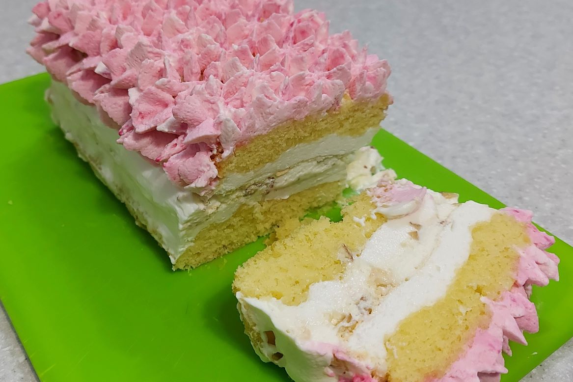Тортик, который готовится быстро. Для коржа: масло слив. 50 гр. сахар 50 гр. желтки 2 шт. молоко 2 ст. л. мука 75 гр. разрыхлитель 1/2 ч. л. Для меренги: белки 2 шт. сахар 100 гр. крахмал кукурузный 10 гр. соль щепотка лимонная кислота щепотка. Орехи. Крем: сливки 33% 150 мл. сахар 1 ст. л. Готовьте с удовольствием!