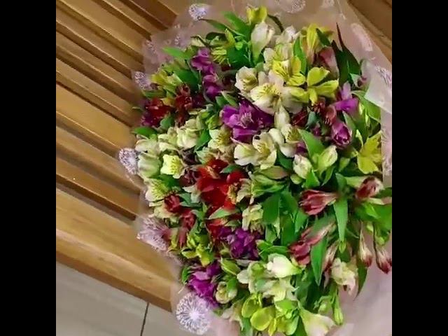 Букет с альстромерией в упаковке Кулечек сладостей