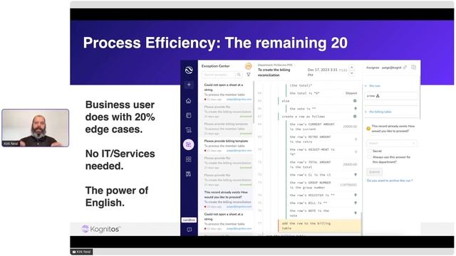 Watch our first webinar to explore the next phase of process automation, powered by Generative AI. Kognitos, our cutting-edge automation platform, has emerged as a game-changer for businesses looking to transcend the limitations of traditional Robotic Process Automation (RPA) technologies. Today, businesses are turning to innovative solutions like Robotic Process Automation (RPA) to streamline operations and enhance efficiency. However, conventional RPA solutions have faced notable challenges, particularly in managing exceptions, sustaining bot functionality, and scaling operations. Kognitos, our cutting-edge, Generative AI-powered automation solution, is poised to revolutionize the industry by directly tackling these fundamental issues. In the first episode, we delve into the problems faced by enterprises while automating business processes using legacy automation technologies such as RPA and the transformative experiences they are exposed to with Kognitos. This webinar will introduce the groundbreaking advancements of Kognitos, showcasing its potential to revolutionize productivity in process automation. Join us as we delve into the benefits it offers, tackle the new challenges it presents, and provide insights on overcoming them.