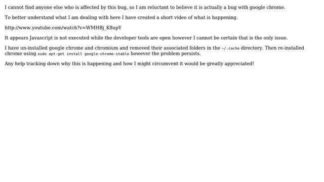 having Google Chrome developer tools open causes pages to not render/load properly Helpful? Please support me on Patreon: https://www.patreon.com/roelvandepaar With thanks & praise to God, and with thanks to the many people who have made this project possible! | Content (except music & images) licensed under cc by-sa 3.0 | Music: https://www.bensound.com/royalty-free-music | Images: https://stocksnap.io/license & others | With thanks to user rlemon (https://askubuntu.com/users/34049), and the Stack Exchange Network (http://askubuntu.com/questions/94614). Trademarks are property of their respective owners. Disclaimer: All information is provided "AS IS" without warranty of any kind. You are responsible for your own actions. Please contact me if anything is amiss at Roel D.OT VandePaar A.T gmail.com.