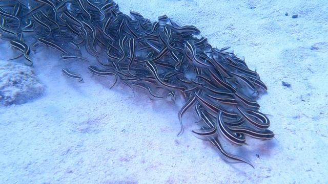 Завораживающее видео стайки жареных сомов:) Plotosus lineatus striped catfish