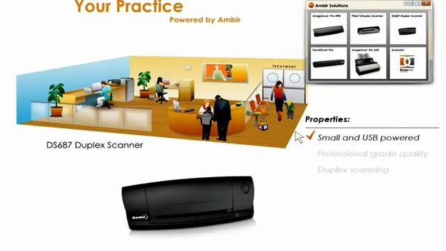 http://www.ambir.com/ambir/small-practices Your Practice Powered by Ambir The ImageScan™ Pro 490i can help at the registration desk by scanning important ID and health information into your EMR or practice management system. The scanner features: •A small footprint. •A single USB powered connection, no AC adapter needed. •Duplex scanning of patient documents. Digitize patient records, insurance cards, IDs, and HIPAA forms •EMR Compatibility. The ImageScan™ Pro 490i works with most EMR and practice management software solutions on the market today For dedicated ID and drivers license scanning at your registration desk choose the DS687. •This compact scanner easily fits on any registration desk •Our scanners are designed for the high volume environments like 24/7 care facilities. •Duplex scanning Ambir also offers, the ImageScan Pro ADF, a back office high-speed ADF scanner for digitizing large amounts of paper records in a short time. Features include: •Versatility. The ImageScan Pro ADF scans documents and ID cards and includes a 20 sheet capacity document feeder for high-volume jobs •A compact footprint. The ImageScan Pro ADF takes up far less space than a comparable ADF scanner.