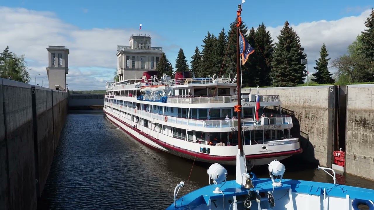 Теплоходы "Огни большого города" и "Феликс Дзержинский" проходят шлюз №16 Городецкого гидроузла