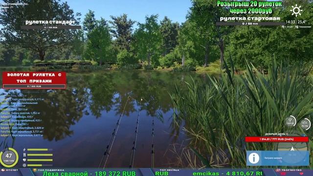 Поддержка донатом https://new.donatepay.ru/@1032463 Альтернативный донат https://www.donationalerts.com/r/kalyamba11 5536913964533059 карта Тинькоф Если стрим лагает,смотри стрим на трово https://trovo.live/s/Kalyamba_na_Ribalke Мой ВК - https://vk.com/kalyantv НИК в игре kalyan11 НАШ ДИСКОРД СЕРВЕР https://discord.gg/QhtSPKp3 Заказ водоема на 1 час - 500р ( весь стрим 2500р ) Модерка на канале 1200р ( каждая следующая на 100р больше) Озвучка доната на 40р,50р,100р,200р,300р,500р,1000р ✅Призы в рулетке "ЗОЛОТАЯ" ✔ ЗОЛОТО ✔ ПРЕМ ✔ КАТУШКИ ЮБИЛЕЙНАЯ БОРЕЛИКА, ВЕНГИ, ТАЙГА, СИЛЬВЕР 80, И другие ✔ ПАЛКИ ПИЛКЕРНАЯ, ДОНКА МОРСКИЕ, ✔ РОД ПОД, СТУЛЬЯ ✅Призы в рулетке СТАНДАРТ : ✔ катушкИ ЮБИЛЕЙНАЯ БОРЕЛИКА, ВЕНГИ, ТАЙГА, СИЛЬВЕР 80, И другие ✔ катушки 60 для медного ( ЭВИИ, НАТОРЫ, ГОЛДА, и тд) ✔ ПИЛКЕРНОЕ УДИЛИЩЕ КОРОЛЕВА ОКЕАНА ✔ Морское Донное удилище ✔ прем ( 3, 7, 30 дней) ✔ золото ( 1, 3, 5, 10, 20 ,50) ✔ билет на море ( 1, 3, 5 дней) ✔ голд наживка и др. ✅Призы в рулетке "СТАРТОВАЯ" ✔ катушка "silver80" ✔ катушка "БЕЛЫЙ КАЛИБР" ✔ катушка "Черный калибр" ✔ катушка "Протон" ✔ катушка "Нарга 6000" ✔ Набор Фидерист и спинингист ✔ Карповик Фортуна ✔ фидерные удилища ✔ прем, золото, алкашка, наживки и тд P.s Рулетка это не казино, а награда за поддержку стримера. Вечный ТОП ПОДДЕРЖКИ (11.05.2024) 1. Dimon_pokemonchik 119 784 2. Interceptor 75 508 3. Skreb79 71 261 4. une personne 68 619 5. Нарвал77 31 550