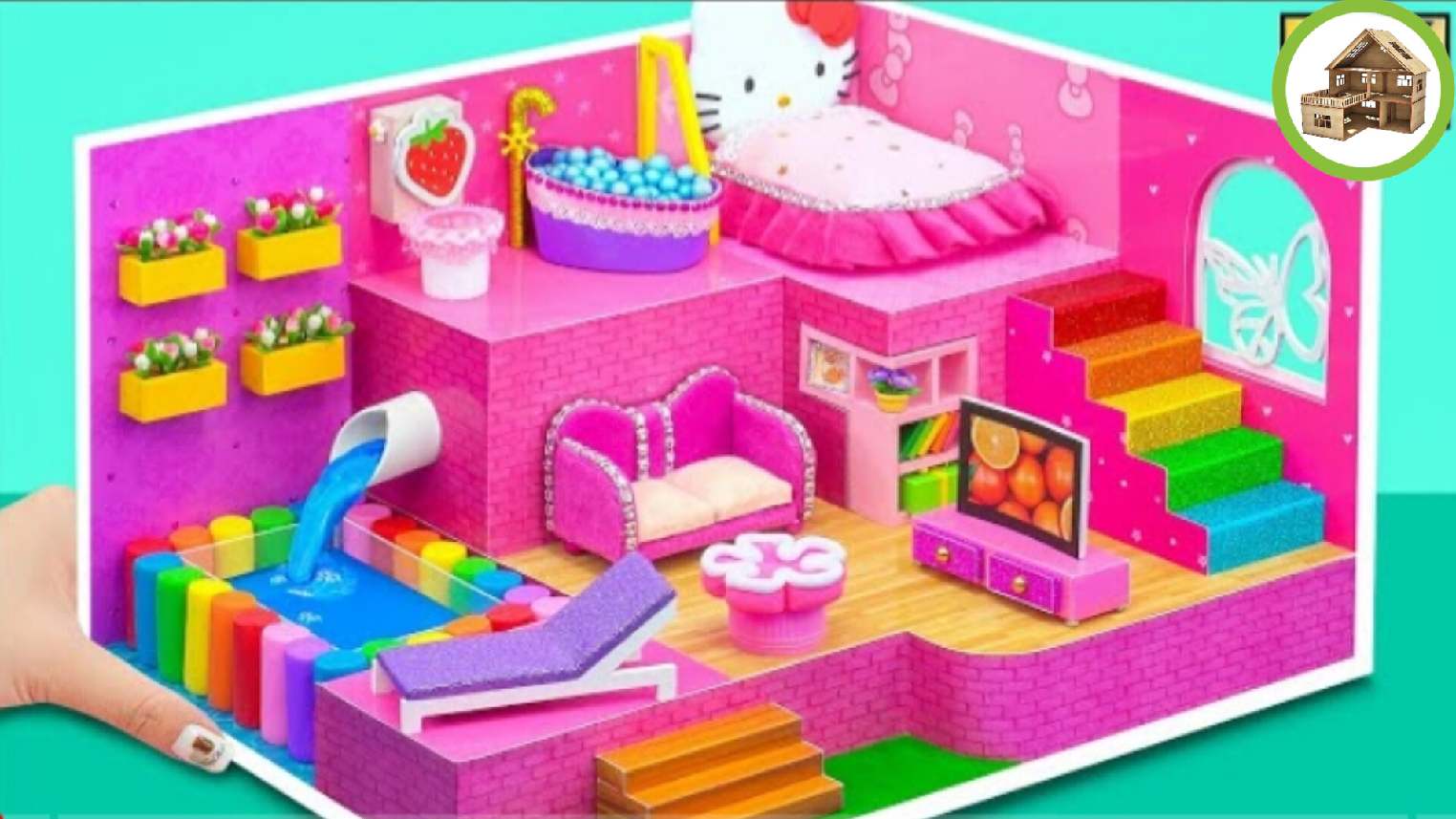 Практичный домик hello kitty с ванной комнатой и гостиной бассейном из картона своими рукам #89