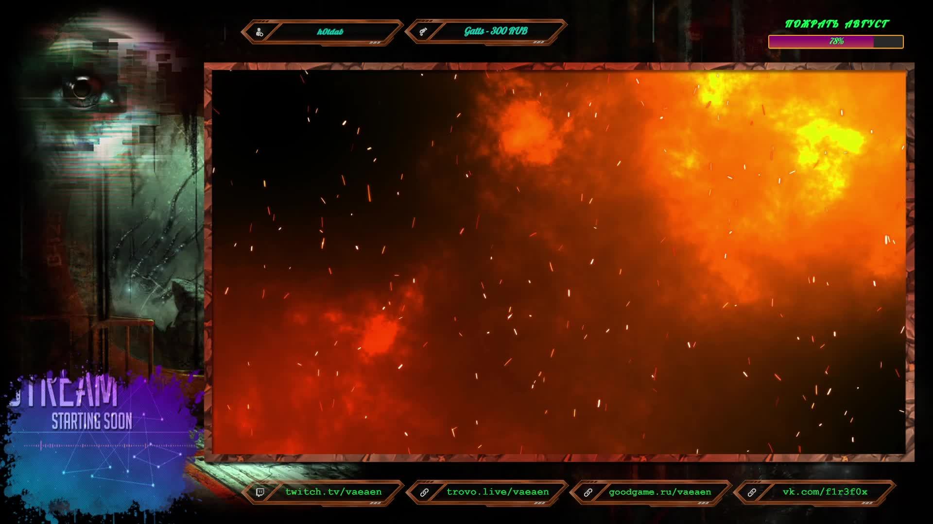 Если хотите поддержать меня как стримера - нажмите по данной ссылке https://www.donationalerts.com/r/f1r3f0x Во время стрима ваше сообщение появится на экране, и будет сопровождаться голосовым диктором. Поддержка на Boosty https://boosty.to/vaeaen Поддержка без комиссии: Сбер: 2202 2010 0629 1039 Тинькофф: 2200 7008 4677 0625 Основные каналы: Twitch: https://www.twitch.tv/vaeaen Trovo: https://trovo.live/Vaeaen GoodGame: https://goodgame.ru/channel/Vaeaen/ VKplay: https://vkplay.live/vaeaen Wasd: https://wasd.tv/vaeaen YouTube: https://www.youtube.com/channel/UCsl3CyRcImUYtWiCgEdvmjQ