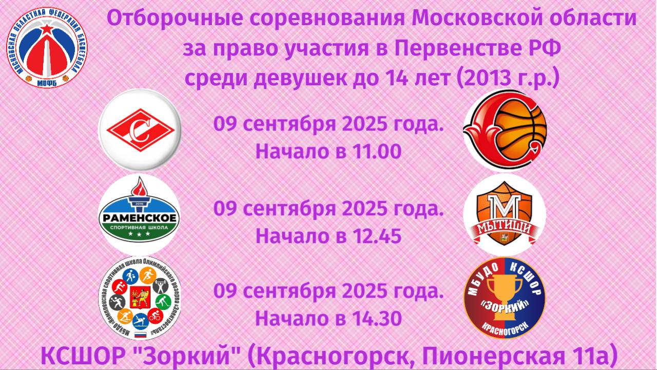 09.09.2025. Отборочные Д2013: - 11.00 Люберцы - Видное - 12.45 Раменское - Мытищи - 14.30 Электросталь - Красногорск