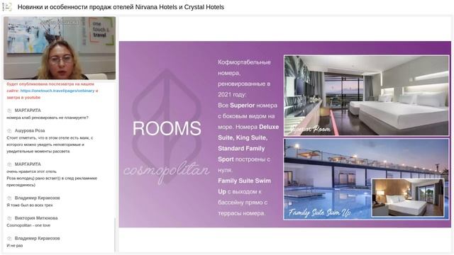 Наши добрые партнеры Nirvana Hotels и Crystal Hotels в лице Ирины Казаковой рассказали самые свежие новости и поделились особенностями продаж отелей. Сейчас в семейство отелей входит 20 объектов размещения. Три Nirvana: - Nirvana Mediterranean, - Nirvana Dolce Vita, - Nirvana Cosmopolitan, - и 17 отелей Crystal: - Crystal Centro Resort & SPA - Crystal Family Resort & Spa - Crystal Palace Luxury Resort & Spa - Crystal Prestige Elite Resort & SPA - Crystal Sunrise Queen Luxury Resort & Spa - Crystal Sunset Luxury Resort & Spa - Crystal Tat Beach Golf Resort & Spa - Crystal Paraiso Verde Resort & Spa - Crystal Green Bay Resort & Spa - Crystal Admiral Resort Suites & Spa - Crystal Aura Beach Resort & Spa - Crystal Deluxe Resort - Crystal Flora Beach Resort - Crystal Waterworld Resort & Spa - Crystal Land of Paradise - Crystal World of Colours - Crystal Boutique Beach Resort Самые значительные изменения произошли в Сrystal Paraiso Verde Resort&Spa 5. Отель подвергся полной реновации и полностью изменял концепцию. Сегодня Сrystal Paraiso Verde Resort&Spa 5 теперь ориентируется больше на молодежный отдых. Вся самая актуальная информация в вебинаре ?