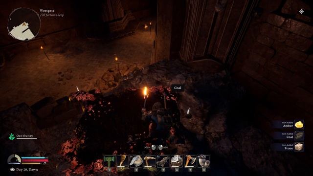Исследовал закутки зала, где была жила железа. Нашел в этом же зале жилу угля. Скопал её целиком и нашел в ней сундук. Отбил осаду лагеря. Нашел зал, с проклятыми тенями и ведущий дальше в шахты.