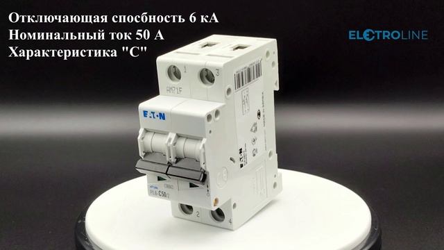 Модульный автоматический выключатель производства Eaton. Номинальный ток 50А, кривая отключения "С". Состоит из 2 полюсов, с отключающей способностью 6 кА. Крепление на Дин-рейку. Узнать подробнее вы можете на странице товара в нашем интернет магазине по ссылке: https://electroline.ru/product/pl6-c502-avtomaticheskiy-vyklyuchatel-50a-krivaya-otklyucheniya-s-2-polyusa-otkl-sposobnost-6-ka.html