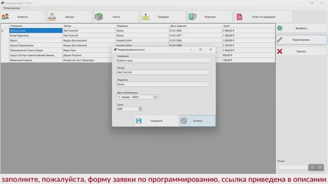 https://kursovik.com/programming/101450416.html Автоматизированная информационная система «Книжная лавка» (книжный магазин). Дипломная работа (ВКР). Среда разработки: Visual Studio. Технология разработки: WindowForms. Среда программирования: Visual C# .NET 2019. База данных: SQLite. Программный продукт позволяет автоматизировать работу книжного магазина. При авторизации пользователь должен указать логин и пароль, после чего может добавлять/редактировать/удалять данные. В системе ведется учет клиентов, авторов книг, книг в магазине, а также издательств, которые выпускают книги. Для ввода справочных сведений используются вспомогательные формы. Также в системе предусмотрена возможность регистрировать продажи книг, и при регистрации пользователь должен выбрать книгу и указать кол-во продаваемых экземпляров. На основании данных о продажах можно сформировать отчет, отражающие сумму продаж в разрезе каждого дня. Отчет генерируется в формате PDF и находится в корне программы. Приобрести исходники(все файлы проекта) данной программы Вы можете, заполнив следующую форму: https://kursovik.com/programming/101450416.html?camefrom=rutube#form Заказать отчёт(описание): https://kursovik.com/programming/101450416.html?camefrom=rutube#pz_need Заказать модификацию: https://kursovik.com/uniform.html?modify=101450416&camefrom=rutube Заказать новую программу: https://kursovik.com/programming_order.html?camefrom=rutube Задать вопрос автору: https://kursovik.com/programming/101450416.html?camefrom=rutube#vopros Наш Телеграм-БОТ для поиска готовых работ по программированию https://t.me/kursovikcom_bot , в нашей базе более 5и тысяч готовых работ, для более эффективного поиска используйте наш Телеграм-БОТ. Список наших готовых работ по программированию: https://kursovik.com/progtopic.html?camefrom=rutube Разработка программ на заказ согласно Вашему заданию: https://kursovik.com/programming_order.html?camefrom=rutube Мы пишем программы практически на всех языках программирования, работаем с различными базами данных, выполняем как мелкие задачки, так и крупные проекты. Разрабатываем и запускаем в работу ЧАТ-БОТы. Обращайтесь - всегда будем рады Вам помочь! Если нужно переписать данную программу на другой язык программирования - обращайтесь - сделаем. Адрес нашего сайта: https://kursovik.com Наши контакты: https://kursovik.com/contacts.html Наша группа ВК: https://vk.com/kursovik (всем подписчикам скидка 5%) Наш Телеграм-канал: https://t.me/kursovik (всем подписчикам скидка 5%) Наш Дзен-канал: https://dzen.ru/kursovik (всем подписчикам скидка 5%) Наш RuTube-канал: https://rutube.ru/channel/41864889 (всем подписчикам скидка 5%) Наш YouTube-канал: https://youtube.com/@kursovik_com (всем подписчикам скидка 5%) (скидки не суммируются :-) #дипломнаяработа #базыданных #visualstudio #программирование