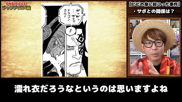 ※ジャンプ最新話1074話ネタバレ注意※ ジャンプのワンピースの最新1074話の内容のネタバレがあります! アニメ派・コミックス派の方々はお気をつけください! 最新話1074話の初見リアクション・感想動画はコチラ! →https://youtu.be/74ubgs-7i_k 【関連動画】 ・【 ワンピース 最新話 】う"わぁあ!ラストマジかよ!? 本当に良かった…けどなぜ…!? モルガンズもくまもベガパンクもヤバすぎな回!※ジャンプ最新1074話ネタバレ注意 考察 →https://youtu.be/74ubgs-7i_k ・【 ワンピース 】懸賞金ハイ&ローゲーム!ビブルラッシュでやってみたら超楽しかったww / ONE PIECE →https://youtu.be/p2_arh8DT1g ・【 ワンピカード 】まさかのあのレアカードが…!? 強大な敵ブースターパック1BOX開封した結果…!ONE PIECE →https://youtu.be/_zZc9mPLBGo 【目次】 00:00 あいさつ 00:49 ビビの身に起こった事件 13:08 エッグヘッド島内の謎の敵 ★ONE PIECE公式YouTube番組『仲間がいるよTube!!!!』レギュラー出演中! 毎週木曜配信!そちらもぜひ!🤩 ・第一回 →https://youtu.be/SQWQ43j3Vo0 ・ONE PIECE公式YouTubeチャンネル →https://www.youtube.com/channel/UCdAHaWcKdpbT5XkN2Er6BUQ ☆おすすめ動画 ・ワンピースキャラの名前でウィーアー! ONE PIECE / VIVRE CARD →https://youtu.be/UDw8HlUX5JE ・ワノ国編キャラの好物だけで一週間生活した結果…!! →https://youtu.be/nRdJGRO-gb4 ☆ONE PIECE VIVRE CARDの動画はこちら! ・あの件で『ワンピース公式』から呼び出されました…… →https://www.youtube.com/watch?v=yC7xGhZERW8&t=128s ・【ワンピース最新ビブルカード】ロジャーの愛刀の名前がヤバすぎる!! マルコの懸賞金も白ひげのアレも革命軍の○○も判明!? ※ネタバレ注意 ONE PIECE 考察 →https://www.youtube.com/watch?v=CXAvjgyrhrQ いつも動画見てくれてありがとう!! ワンピース最新話考察感想やワンピースファンが楽しめる動画アップしてます! チャンネル登録・グッドボタン👍よろしくオネガイシマス!!!🤩 チャンネル登録はこちら! ⇒https://www.youtube.com/user/TAKASHIsTV?sub_confirmation=1 【YouTube】 ▼オネガイシマス海賊団!!!【ワンピースファンチャンネル】 https://www.youtube.com/user/TAKASHIsTV ▼OSPの旅チャン!【ロケ&バラエティ】 https://www.youtube.com/channel/UC8Ngo_wRk_4eyubEMfIboBA ▼オネガイシマス海賊団!!!【漫画・アニメチャンネル】 https://www.youtube.com/user/TAKASHIsONEPIECE ・個人チャンネル ▼タカシのおうち https://www.youtube.com/user/TakashiOowada ▼Kのエンタメ村 https://www.youtube.com/channel/UCZyLpQqjURVXubBXjYmySFw ▼占いスタジオHoshi https://www.youtube.com/channel/UCILt-JXIA_2oHNNCqnRyo-w ▼佐藤のジャニヲタハウス【アラサー男子】 https://www.youtube.com/channel/UCVLHdH6fKfYMLA1LRuiaI8A ★オススメの再生リストはこちら! ・VIVRE CARD動画 https://www.youtube.com/watch?v=ObN2Zg4nHJM&list=PLvn32kOB0qYphNJu1z8gjJM-icH16EAzE ・ONE PIECE動画 https://www.youtube.com/playlist?list=PLvn32kOB0qYprWmN6MJ_31IodJpbq24CT ・ミュージック動画 https://www.youtube.com/playlist?list=PLvn32kOB0qYoRF_Wnof6BxkKwgzk3gxiL 【Twitter】 ▼オーワ・D・タカシ (ONE PIECE新型ファンブック『VIVRE CARD~ONE PIECE図鑑~』公認YouTuber) https://twitter.com/TakashiOowada ▼K https://twitter.com/OSP_K777 ▼ハーフくん https://twitter.com/numakunkun ▼作家 佐藤 https://twitter.com/sakasakasato ▼Hoshi https://twitter.com/hoshikentaro 占いブログ https://www.hoshi-tesou.com/ 【Instagram】 ▼TAKASHI https://www.instagram.com/owa.d.takashi/?igshid=l654j7on7rbr ▼K https://www.instagram.com/osp_k777/ 【MUSIC】 ▼新アルバム『≒30』全9曲 エンディング曲『1.2.3!』『オネガイシマス!』収録 [ 動画 ]https://youtu.be/WbOdHN_Sa5Q [ iTunes ]https://music.apple.com/jp/album/1436823499?app=itunes ▼1.2.3! [ PV ]https://youtu.be/Qg_R7i-J3Mk [ iTunes ]https://music.apple.com/jp/album/1-2-3/1436823499?i=1436823523 ▼明日は変わるさ [ PV ]https://www.youtube.com/watch?v=0EhaFoE-XcA [ iTunes ]https://music.apple.com/jp/album/895534952 【LINE】 ▼公式LINEアカウント [ ID ]@SLR2372E [ QR ]https://twitter.com/TakashiOowada/status/578925777527263232 ▼LINEスタンプ https://store.line.me/stickershop/product/1025351 ▼K [ ID ]@HEW0521S [ URL]http://line.me/ti/p/@hew0521s 【グッズ】 ▼公式グッズショップ『OSP SHOP』 https://ospshop.base.shop/ 【ファンレターなど】 ▼プレゼントやファンレターの宛先が変わりました!! 〒150-6018 東京都渋谷区恵比寿4-20-3 恵比寿ガーデンプレイスタワー18階 株式会社LuaaZ オネガイシマス海賊団宛 ※冷蔵・冷凍が必要な『なま物』の受付はできません。 ※ご縁があり場所だけお借りしております。現在フリーで活動中です! 【お仕事のご連絡などはコチラでお待ちしております】 takashis.tv@gmail.com #onepiece #ワンピース #最新話 ※Amazonリンクはアソシエイトリンクを使用しています。 ------------------------------------------------------------------------------ 素材提供:PIXTA 楽曲提供:MusMus ------------------------------------------------------------------------------