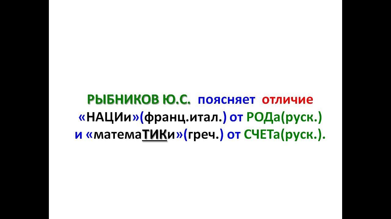 РЫБНИКОВ Ю.С. поясняет отличие "НАЦИи"(фр.,ит.) от РОДа(руск.) и "матемаТИКи"(греч.) от СЧЕТА(руск.)