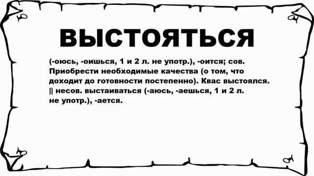 Хочешь знать что значит ВЫСТОЯТЬСЯ? тогда слушай до конца. (-оюсь, -оишься, 1 и 2 л. не употр.), -оится; сов. Приобрести необходимые качества (о том, что доходит до готовности постепенно). Квас выстоялся. || несов. выстаиваться (-аюсь, -аешься, 1 и 2 л. не употр.), -ается. Больше слов: #слова #словарьрусский #значениеслов