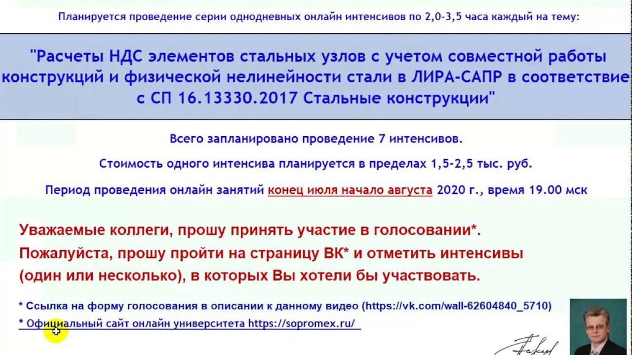 Тренинг запущен - ссылка на сайт https://makeev.justclick.ru/uzel2020 Официальный сайт онлайн университета https://sopromex.ru/ 1. Моделирование и расчет НДС элементов баз колонн, мачт, рекламных щитов с учетом совместной работы конструкций и физической нелинейности стали. 2. Моделирование и расчет НДС узлов ферм (ручной счет по СП, моделирование и тестирование в ЛИРА-САПР со сравнением результатов - спаренные уголки по фасонкам с моделированием сварных швов, бесфасоночные фермы из труб «молодечно», круглых труб, учет физической нелинейности стали ...). 3. Моделирование и расчет НДС элементов стыков балок (ручной счет по СП 16.13330.2017 фрикционных соединений на высокопрочных болтах, моделирование фрикционных стыков в ЛИРА-САПР, учет преднатяжения болтов, КЭ 264, моделирование сварных соединений балок, учет физической нелинейности стали...). 4. Моделирование и расчет НДС в ЛИРА-САПР элементов соединения балок с колоннами («шарнирные», «жесткие», монтажные столики, монтажные болты, преднатяжение болтов, КЭ 264, учет физической нелинейности стали...). 5. Фланцевые соединения балок, поясов ферм, труб под давлением (преднатяжение болтов, КЭ 264, силовое и кинематическое загружение, контроль герметичности стыка, учет физической нелинейности стали...). 6. Расчет и моделирование работы антенно-мачтовых объектов с учетом пульсации ветра в ЛИРА-САПР на примерах уличных рекламных щитов, стоек, мачт, радиовышек (моделирование опорных узлов, фундаментов, учет свойств грунтов основания, учет физической нелинейности стали, определение частот собственных колебаний, учет преднатяжения фундаментных болтов, применение КЭ 264 ...). 7. Расчет и конструирование сварных швов по СП 16.13330.2017 с тестированием НДС в ЛИРА-САПР и сопоставлением результатов расчетов (нахлесточные соединения, сварка труб, стыки балок, сварочные швы баз колонн, сварные стыки балок с колоннами, продольные прерывистые швы стоек из коробки швеллеров, учет физической нелинейности стали...).