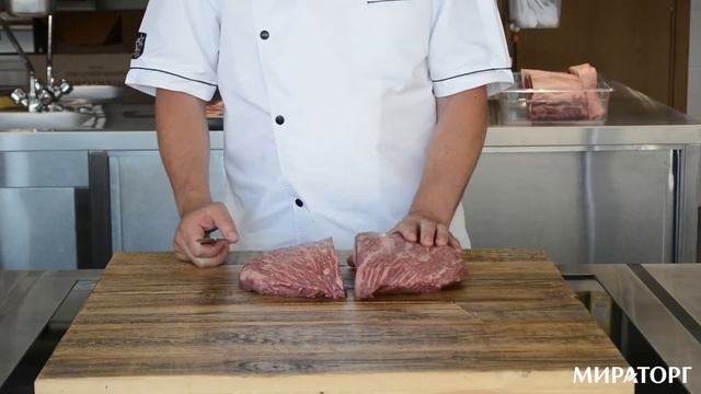 Продолжаем рассказывать о тонкостях нарезки стейков из мраморной говядины Black Angus. Сегодня под руководством бессменного бренд-шефа Мираторга Дмитрия Лазько познакомимся с шейным отрубом. С шейной части говяжьей туши получают мясо с удивительными вкусовыми качествами. В его структуре много прослоек жира, что позволяет удерживать влагу внутри куска при тепловой обработке.
