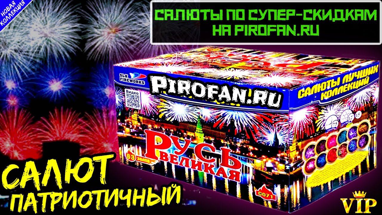https://vk.com/PiroFan - супер скидки в нашем официальном магазине Салют 63 залпа супер+мега-больших, фейерверк "Русь Великая" - Калибр: 30+38мм = 1,25"+1,5" дюйма - Время действия: 75 секунд - Высота выстрела: 40 метров - Срок годности до 2028 года - Есть сертификат и гарантия от ПироФан