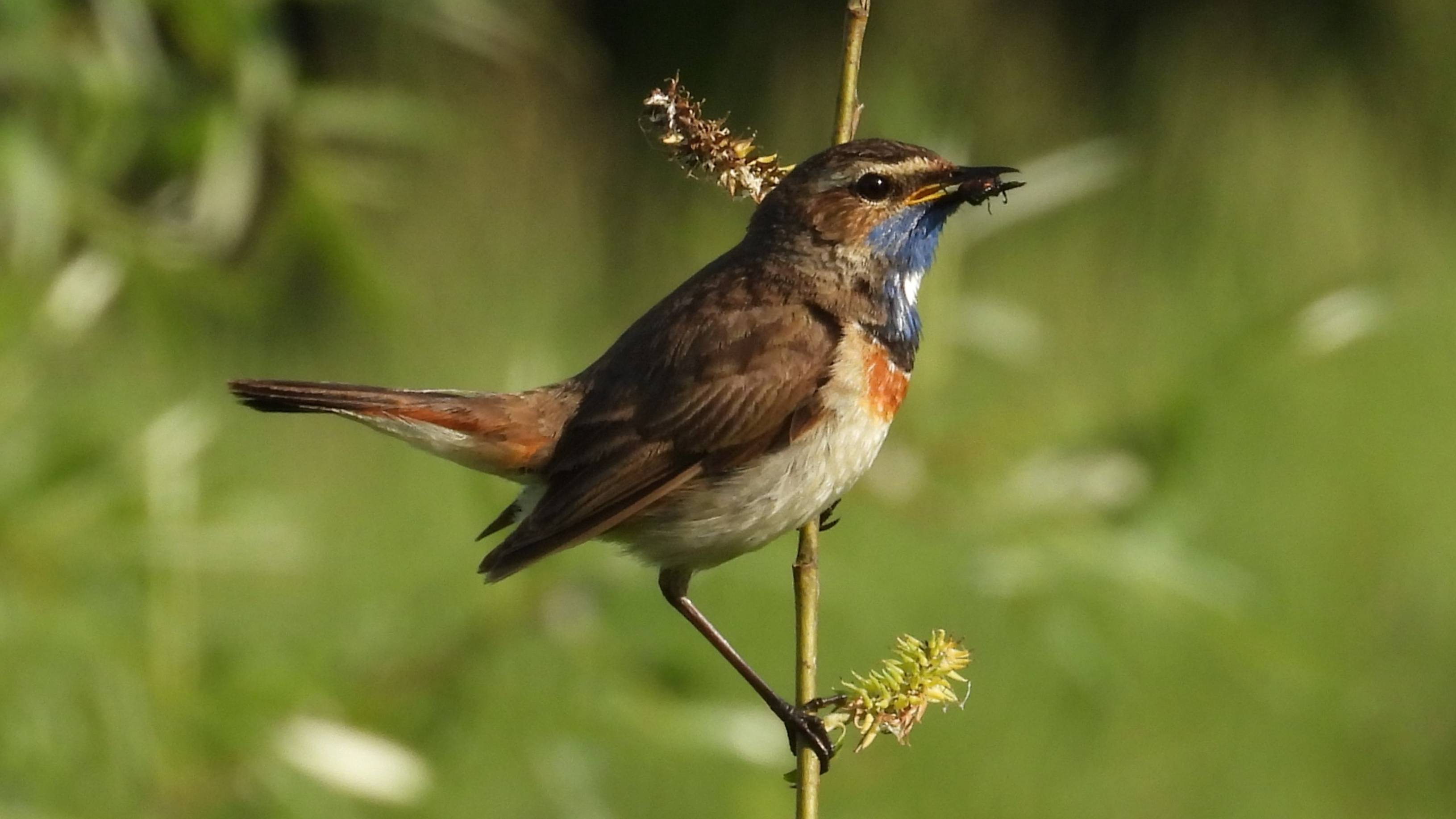 Варакушка с кормом в клюве, наблюдение птиц в Новгородской области 11 июня 2025