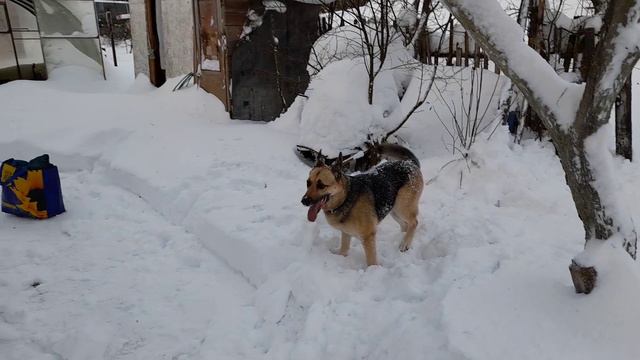 Привезли вещи мамы, и лезем за заготовками к празднику. Сугробы большие придется разгребать и все чистить.Багира очень помогает.