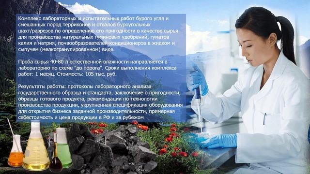 Комплекс лабораторных и испытательных работ бурого угля и смешанных пород терриконов и отвалов буроугольных шахт и разрезов по определению его пригодности в качестве сырья для производства натуральных гуминовых удобрений, гуматов калия и натрия, почвообразователей-кондиционеров в жидком и сыпучем (мелкогранулированном) виде. Проба сырья 40-80 л естественной влажности направляется в лабораторию по схеме "до порога". Сроки выполнения комплекса работ: 1 месяц. Результаты работы: протоколы лабораторного анализа государственного образца и стандарта, заключение о пригодности, образцы готового продукта, рекомендации по технологии производства продукции, укрупненная спецификация оборудования для открытия бизнеса заданной производительности.