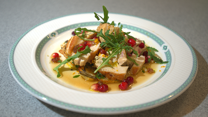 Фаршированная курица с пармезаном, пангрататой и апельсином. Гарнир из картофеля с соусом гремалата