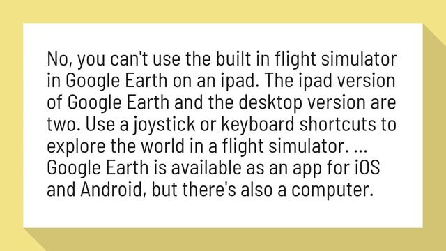 Can Google Earth flight simulator work on IPAD? Google earth flight simulator ipad download Aug 1, 2019 No, you can't use the built in flight simulator in Google Earth on an ipad. The ipad version of Google Earth and the desktop version are two. Use a joystick or keyboard shortcuts to explore the world in a flight simulator. ... Google Earth is available as an app for iOS and Android, but there's also a computer.