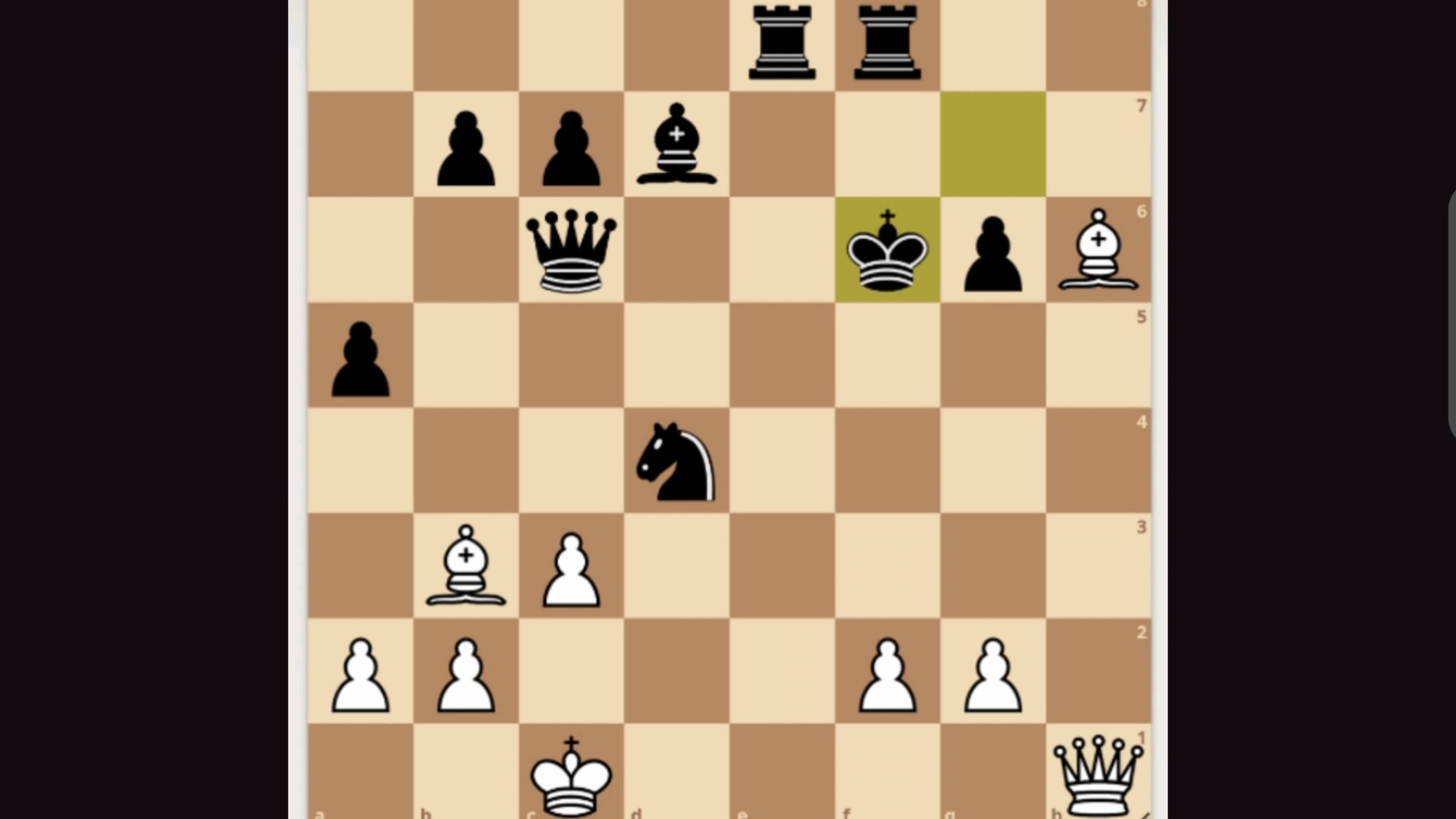 Шахматная задача. Выигрышная позиция. Белые начинают и ставят мат противнику за три хода. Chess problem. White starts and checkmate the opponent in three moves. [Event "Casual correspondence game"] [Site "https://lichess.org/Uyywz23l"] [Date "2025.05.11"] [White "_"] [Black "lichess AI level 8"] [Result "1-0"] [GameId "Uyywz23l"] [UTCDate "2025.05.11"] [UTCTime "18:05:23"] [WhiteElo "1500"] [BlackElo "?"] [Variant "From Position"] [TimeControl "-"] [ECO "?"] [Opening "?"] [Termination "Normal"] [FEN "4rr2/1ppb4/2q2kpB/p7/3n4/1BP5/PP3PP1/2K4Q w - - 4 27"] [SetUp "1"] [Annotator "lichess.org"] 27. Qh4+ Ke5 28. Qxd4+ Kf5 29. Qf4# { White wins by checkmate. } 1-0