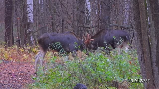 2025/10/28: "Драка". 2 лося-товарища, гуляя вместе, лениво бодаются друг с другом в зареченском лесу